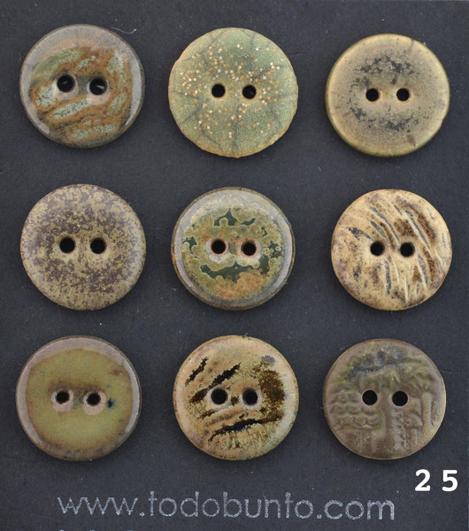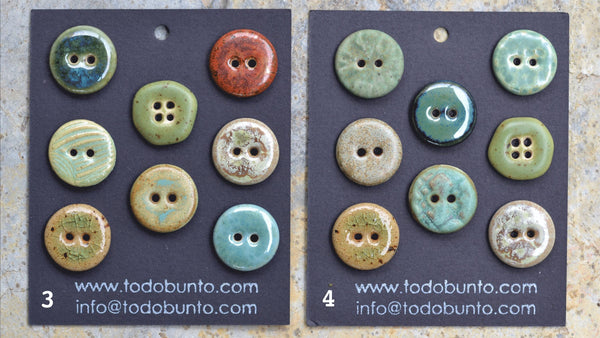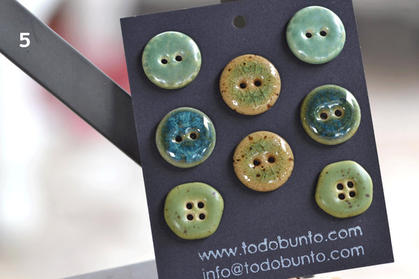 The buttons were fired two times. First firing is the so called bisque firing where temperature goes as high as 1000C degrees. After that our buttons are ready to be glazed. We put 2-4 layers of glaze manually and when they've dried, buttons are fired for the second time at about 1210C-1240C degrees depending on the glaze choice. The backside of the buttons stays unglazed. As this is a mixed set, buttons within one set may be out of different clays, so the backsides are of different colors. One might be white porcelain, the other one black or yellow clay etc.