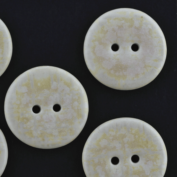 As most other our buttons these were fired two times. First firing is the so called bisque firing where temperature goes as high as 1000C degrees. After that our buttons are ready to be glazed. We put 2 layers of glaze manually and when they've dried, buttons are fired for the second time at about 1230C degrees. The backside of the buttons stays unglazed.