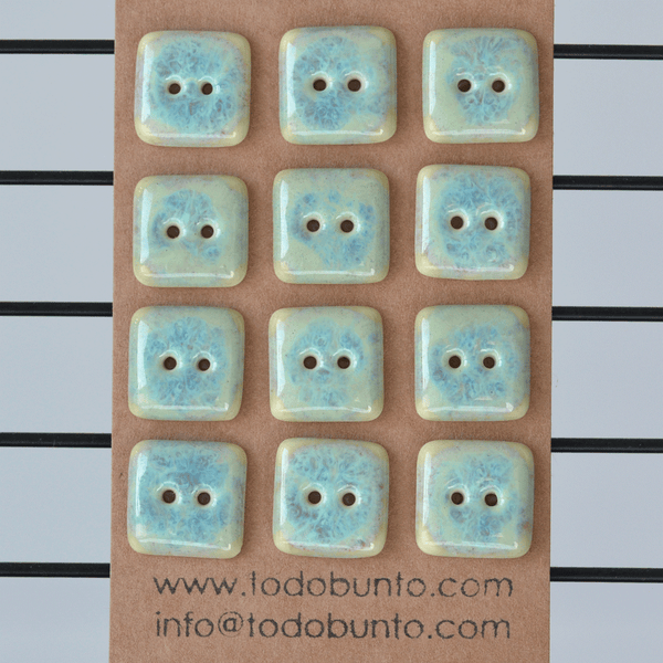 Square ceramic buttons in turquoise. These are about 16x16mm and sold in sets of 12. Please be aware that due to the square shape these buttons look same or even bigger then round buttons in 17-18mm.