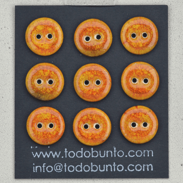 Ceramic buttons burnt orange. These are about 15-16 mm and sold in different sets. Product photo shows a sample set from this series. Glaze gradient is different from buttons to button, photo shows just a sample set.
