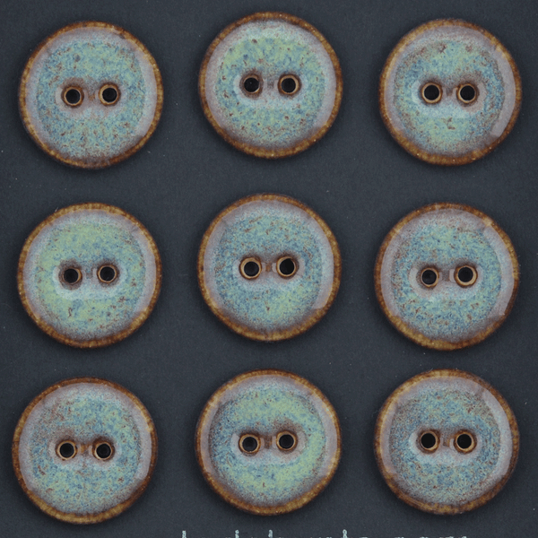 To achieve the final look these buttons are glazed with 2 glazes in overall 4 layers which makes the creation process technically demanding and tricky as the risk of the glaze filling in the holes or sticking to the kiln shelf is extremely high due to the small size of the buttons.