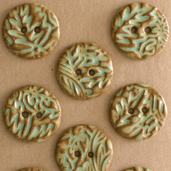 The buttons were fired two times. First firing is the so called bisque firing where temperature goes as high as 1000C degrees. After that our buttons are ready to be glazed. We put 2 layers of glaze manually and when they've dried, buttons are fired for the second time at about 1230C degrees. The backside of the buttons stays unglazed. Its like a stone to the touch.