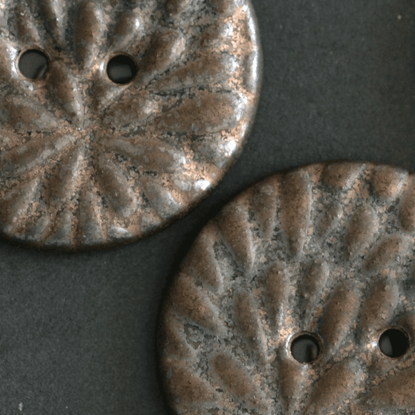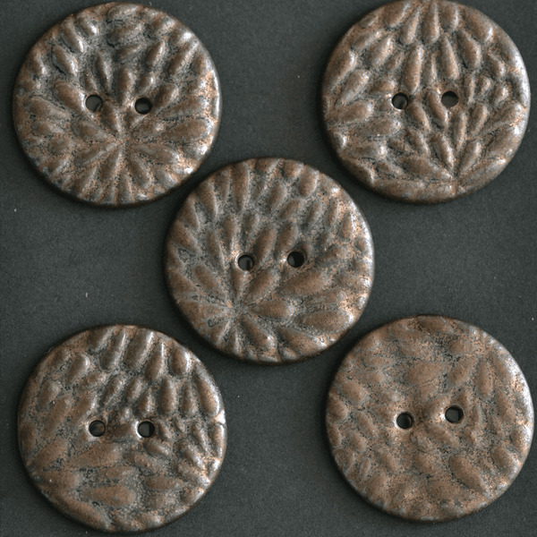 Big ceramic buttons in brown/black metallic look. These are about 27 mm and sold in sets of 5.