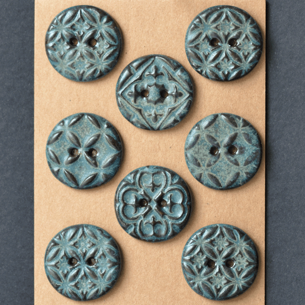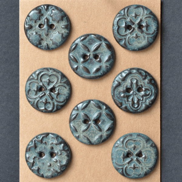 Ceramic buttons in dark blue/brown with oriental motives. These are about 23mm and sold in a sets of 8. Please note that patterns are set together randomly. There are several sets in this series, each has different buttons, see 2 photos as examples.