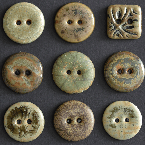 The buttons were fired two times. First firing is the so called bisque firing where temperature goes as high as 1000C degrees. After that our buttons are ready to be glazed. We put 2-4 layers of glaze manually and when they've dried, buttons are fired for the second time at about 1210C-1240C degrees depending on the glaze choice. The backside of the buttons stays unglazed. As this is a mixed set, buttons within one set may be out of different clays, so the backsides are of different colors. One might be white porcelain, the other one black or yellow clay etc.