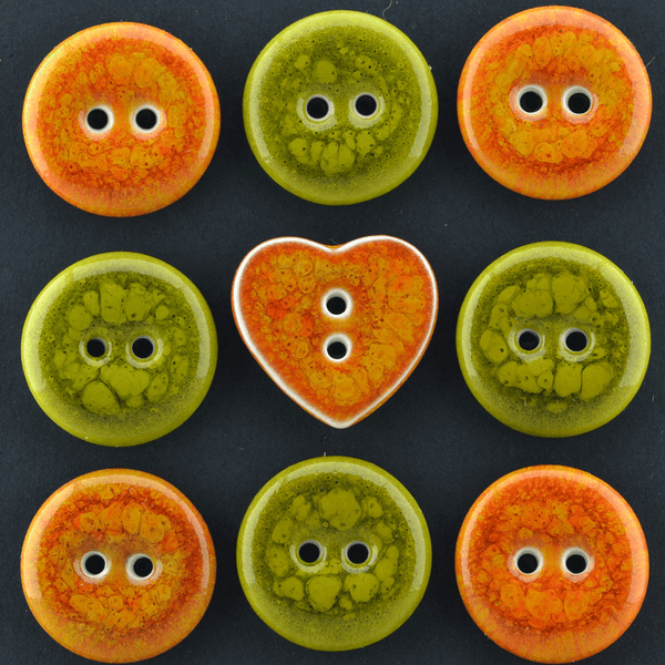 Porcelain buttons glowing orange/acid green. They are about 20-21mm and sold in sets of 9. Please be aware that colors a slightly different from set to set. There were several sets in this design, photo shows just a sample.