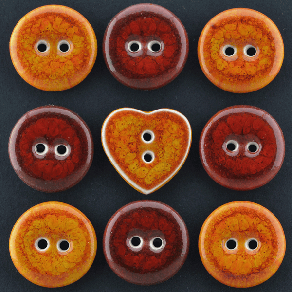 Porcelain buttons glowing orange/red. They are about 20-21mm and sold in sets of 9. Please be aware that colors a slightly different from set to set. There were several sets in this design, photo shows just a sample.