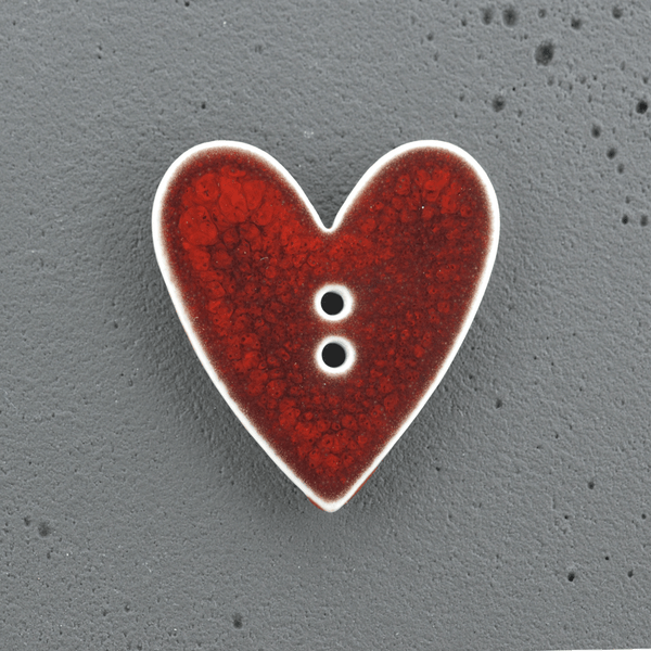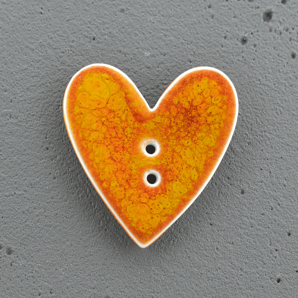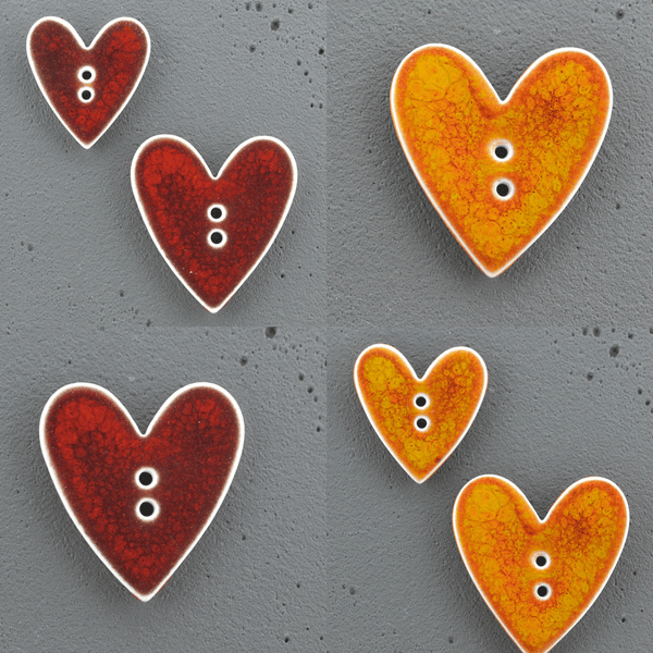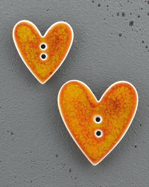Handmade porcelain buttons in form of hearts, sold per buttons. Product photo show samples from this series. The gradient is different from button to button. Please allow minor differences as all the buttons are 100% handmade. Please be aware that this glaze is very sensitive to thickness of the application and its placement in the kiln, so buttons in different sizes or from different firings (although being from the same series) may differ from each other in color.